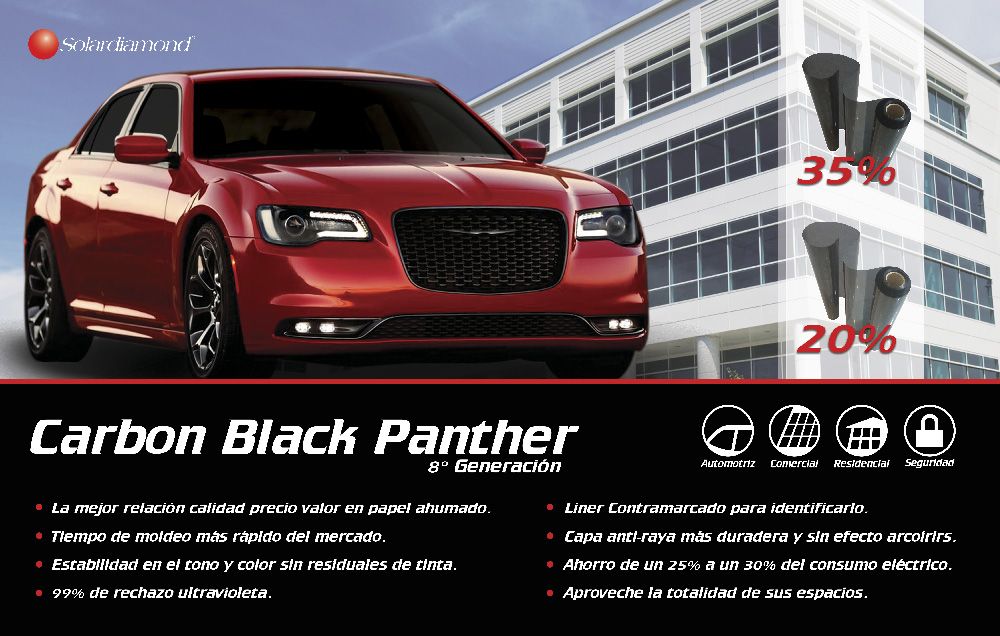 Solardiamond, marca líder en innovación y a la vanguardia con tecnología de punta, ha desarrollado un producto que se presenta por primera vez en el mercado con características únicas de alto rendimiento en 1ply no reflectivo, tono carbón. Teniendo cualidades de filtración infrarroja y bloqueo del rayo ultravioleta, tecnología desarrollada a través de sus pigmentos moleculares de alta resistencia a la degradación, haciendo un producto único en su estilo. La mejor relación calidad precio valor del mercado.